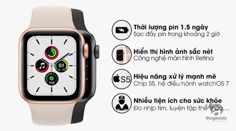 Apple Watch SE có màn hình lớn như màn hình Retina của Series 6, vì vậy bạn có thể xem nhanh được nhiều thông tin hơn. Các cảm biến tiên tiến để theo dõi mục tiêu thể dục và tập luyện của bạn. Và những tính năng ưu việt để giúp bạn luôn khỏe mạnh và an toàn. Ứng dụng Giấc Ngủ thiết lập thói quen đi ngủ và theo dõi giấc ngủ. Bạn cũng có thể nhận cuộc gọi, tin nhắn và nghe nhạc ngay từ cổ tay. Đây là chiếc đồng hồ có vô vàn tính năng nhưng giá nhẹ nhàng không tưởng.