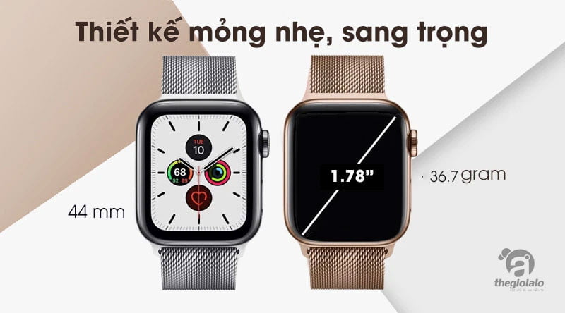 Apple Watch Series 5 GPS + Cellular 44mm thiết kế sang trọng, đẳng cấp với màn hình 1.78 inch phủ kính cường lực Sapphire cao cấp chống trầy, khung viền và dây đeo bằng thép không gỉ bền tốt sáng đẹp, chắc chắn, thoải mái cho cổ tay.