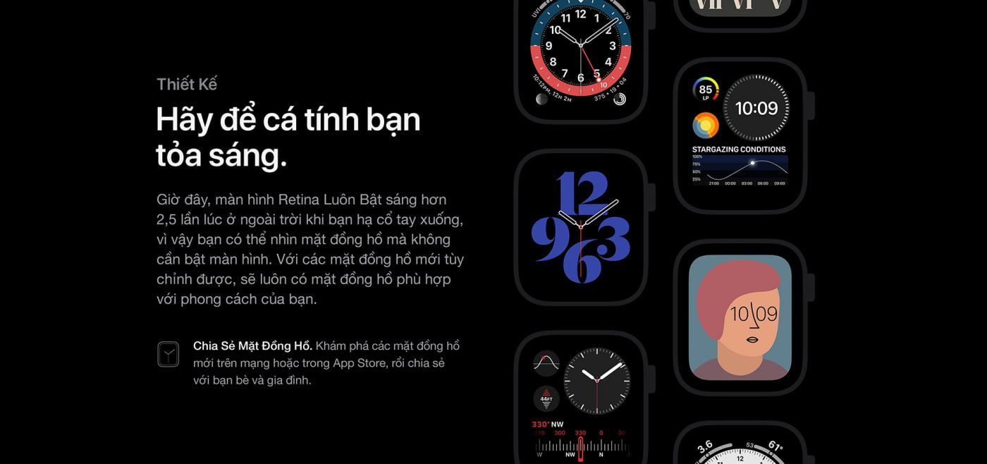 - Xem các chỉ số tập luyện của bạn trên màn hình Retina Luôn Bật đã được cải tiến sáng hơn 2,5 lần lúc ở ngoài trời khi bạn hạ cổ tay xuống.