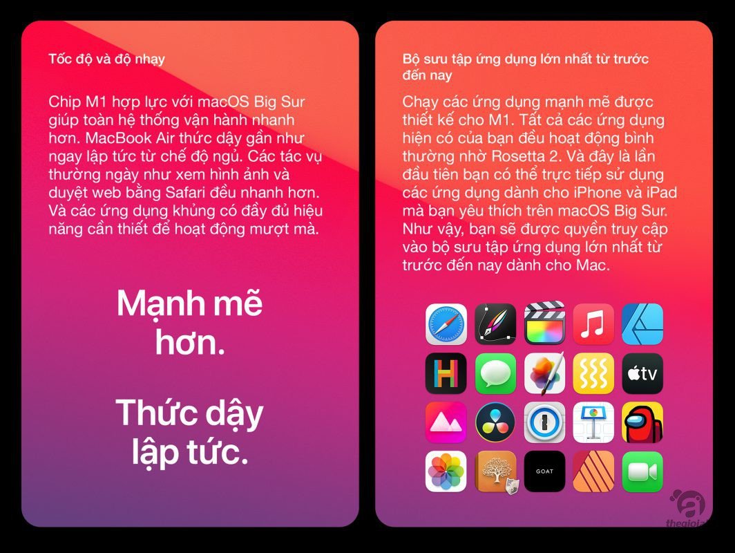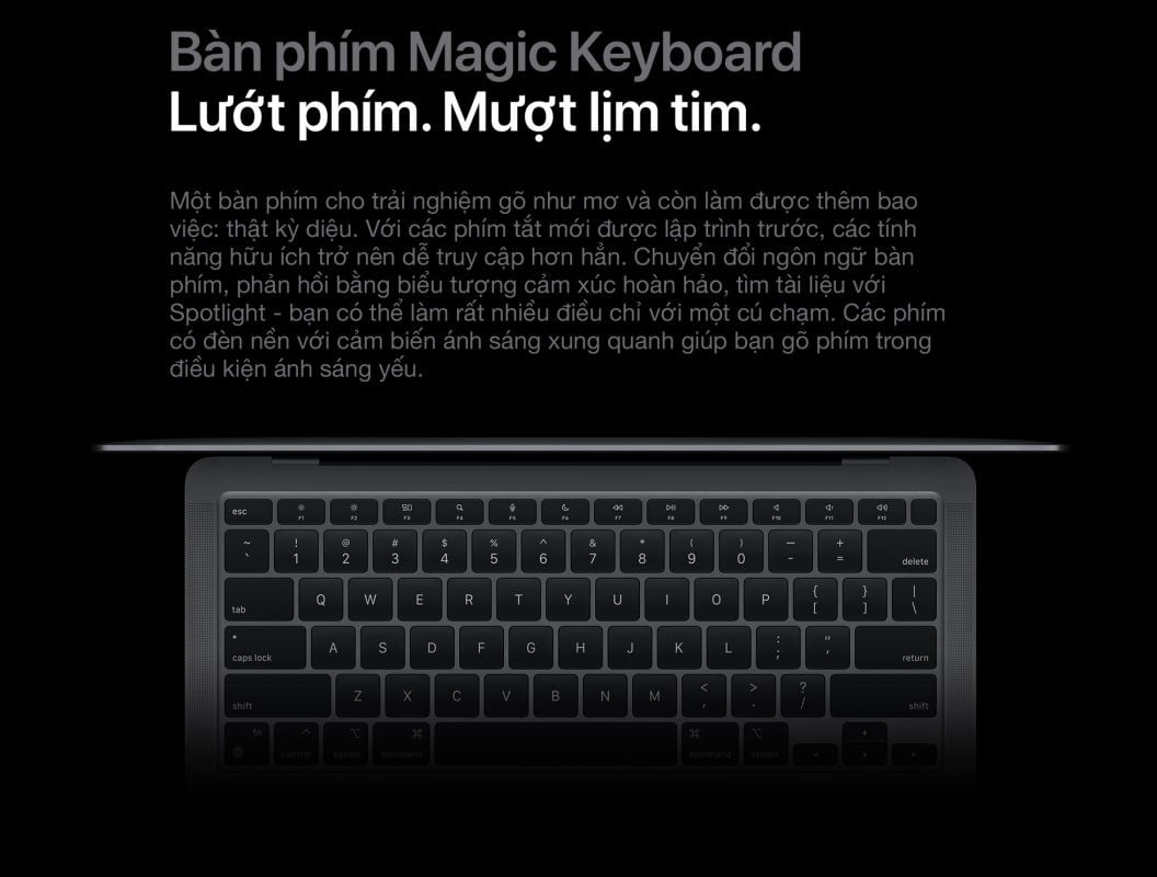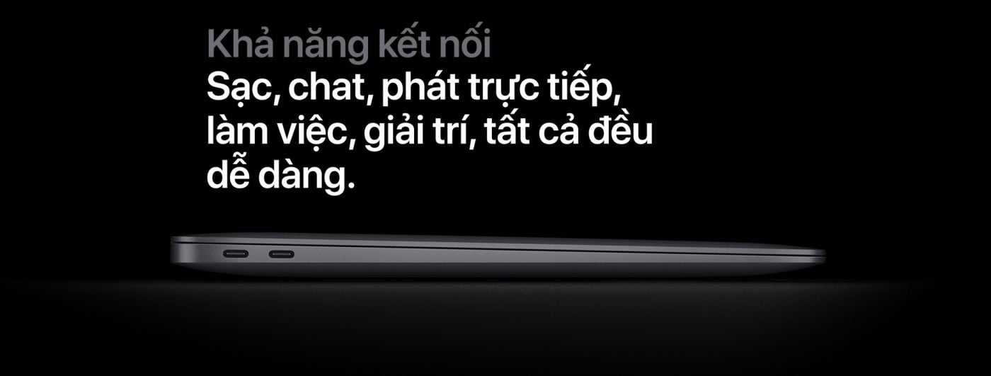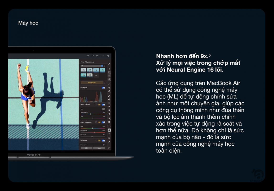 Máy tính xách tay mỏng và nhẹ nhất của Apple, nay siêu mạnh mẽ với chip Apple M1. Xử lý công việc giúp bạn với CPU 8 lõi nhanh như chớp. Đưa các ứng dụng và game có đồ họa khủng lên một tầm cao mới với GPU 8 lõi. Đồng thời, tăng tốc các tác vụ máy học với Neural Engine 16 lõi. Tất cả gói gọn trong một thiết kế không quạt, không tiếng ồn, thời lượng pin dài nhất từ trước đến nay lên đến 18 giờ.1 MacBook Air. Vẫn cực kỳ cơ động. Mà mạnh mẽ hơn nhiều.