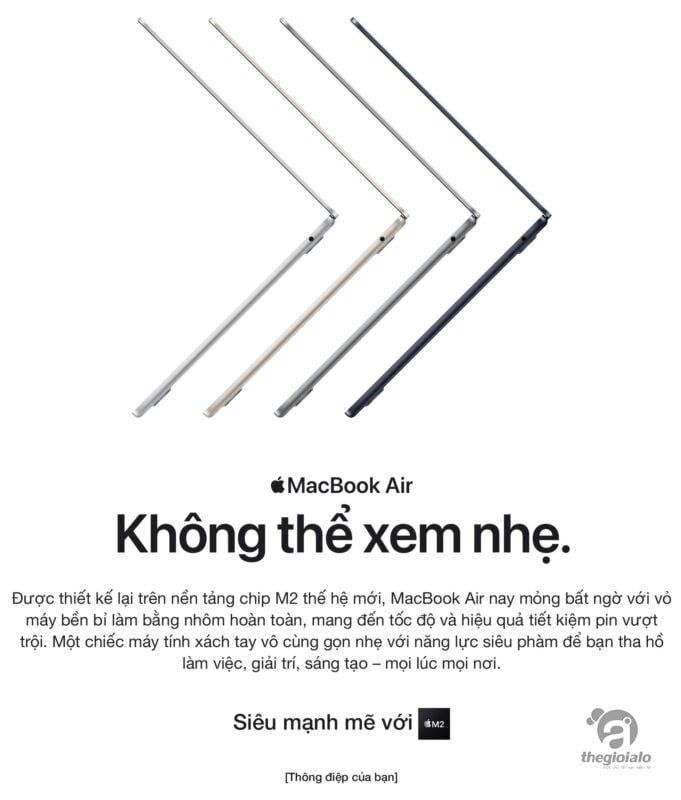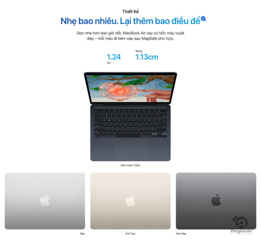 Siêu mạnh mẽ với chip M2 thế hệ tiếp theo, MacBook Air được thiết kế mới, kết hợp giữa hiệu năng đáng kinh ngạc và thời lượng pin lên đến 18 giờ trong vỏ nhôm mỏng ấn tượng.