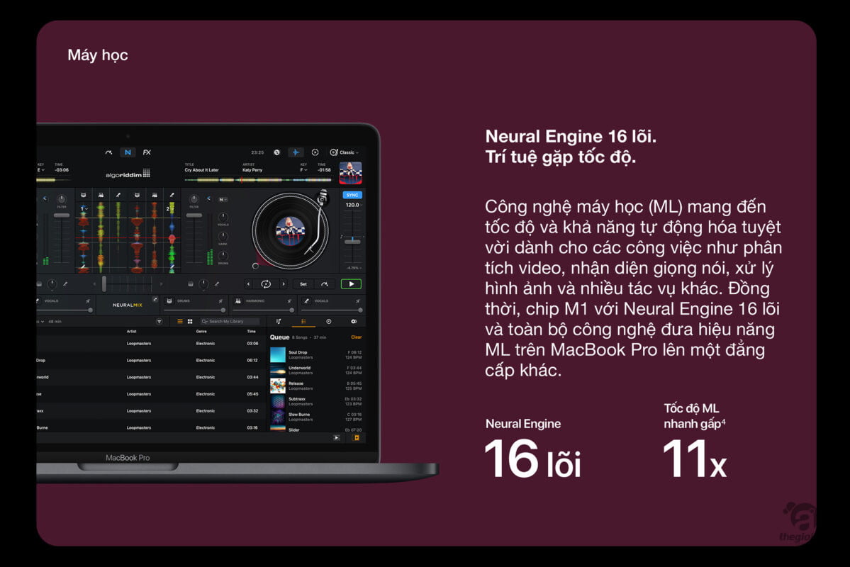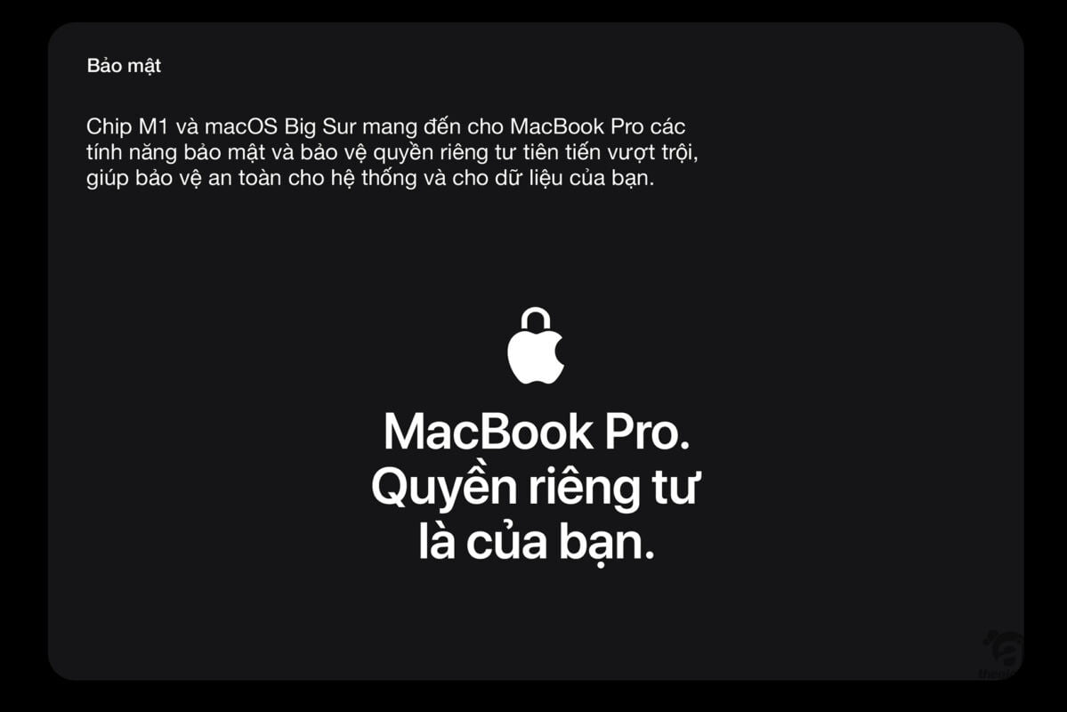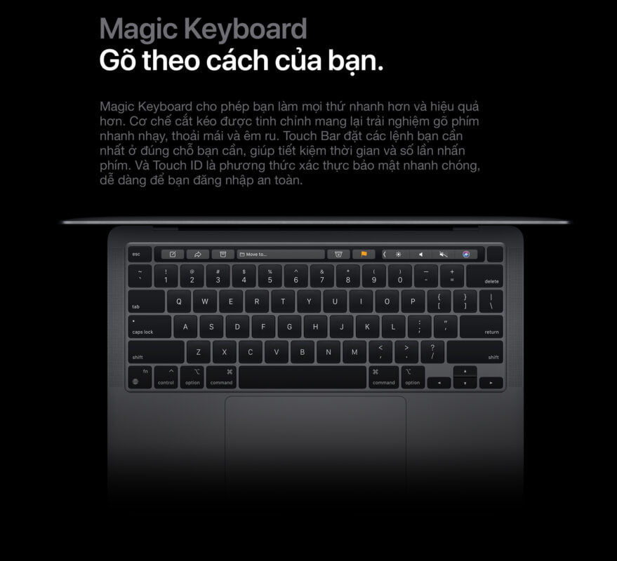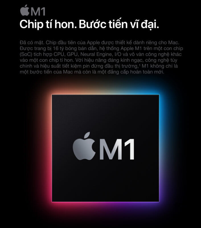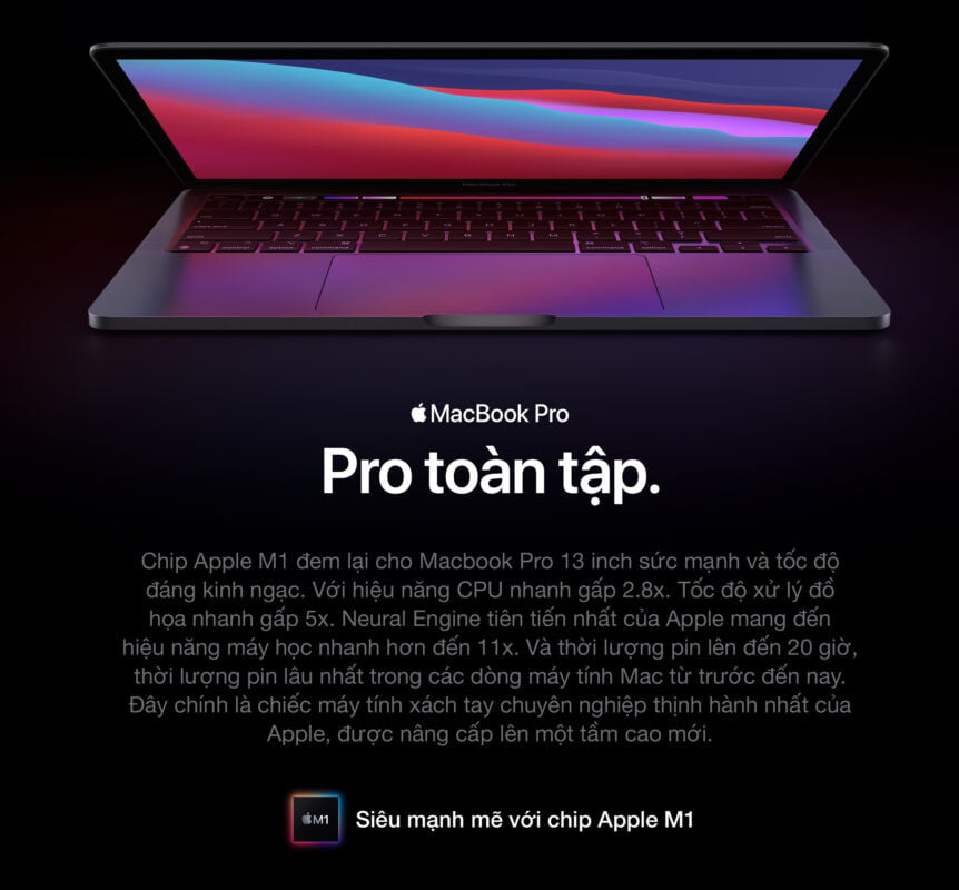 Chip Apple M1 định nghĩa lại MacBook Pro 13 inch. Sở hữu CPU 8 lõi xử lý siêu tốc các luồng công việc phức hợp trong lĩnh vực hình ảnh, mã hóa, biên tập video cùng nhiều việc khác. GPU 8 lõi siêu mạnh xử lý gọn các tác vụ đồ họa khủng và chạy game siêu mượt. Neural Engine 16 lõi tiên tiến tăng cường sức mạnh công nghệ máy học tích hợp trong các ứng dụng yêu thích của bạn. Bộ nhớ thống nhất siêu nhanh cho mọi hoạt động mượt mà. Và thời lượng pin dài nhất từng có trên máy Mac, lên đến 20 giờ.2 Đây chính là chiếc máy tính xách tay chuyên nghiệp thịnh hành nhất của Apple. Hiệu năng cao hơn hẳn, pro hơn hẳn.
