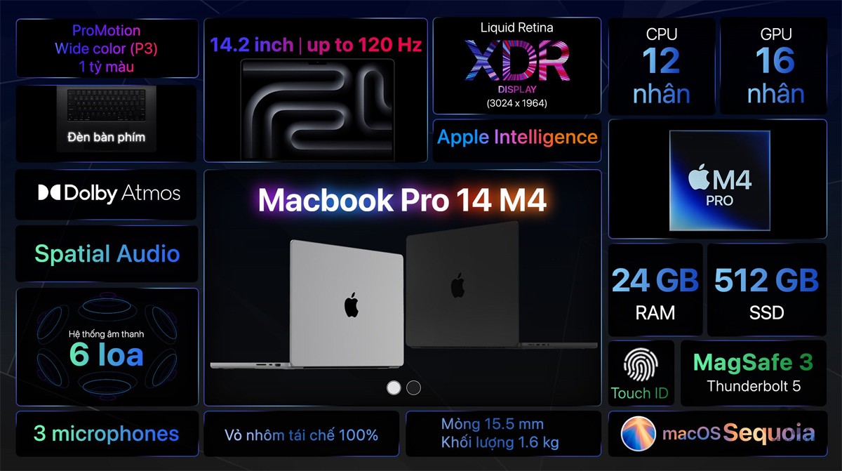 Được trang bị con chip M4 Pro cao cấp, chiếc Macbook Pro 14 của nhà Apple có khả năng xử lý mọi tác vụ mượt mà, nhanh chóng. Cấu trúc của con chip bao gồm 12 nhân CPU và 16 nhân GPU đảm bảo mọi công việc của bạn luôn được vận hành hiệu quả.
