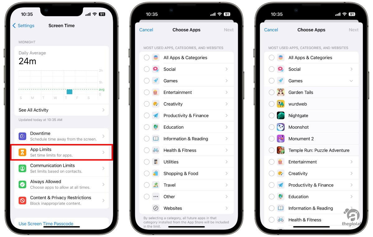 Bằng cách chọn một loại, chẳng hạn như Trò chơi hoặc Giải trí, Thời gian sử dụng sẽ bao gồm tất cả các ứng dụng trong tương lai trong danh mục đó được cài đặt từ App Store sau này trong giới hạn.