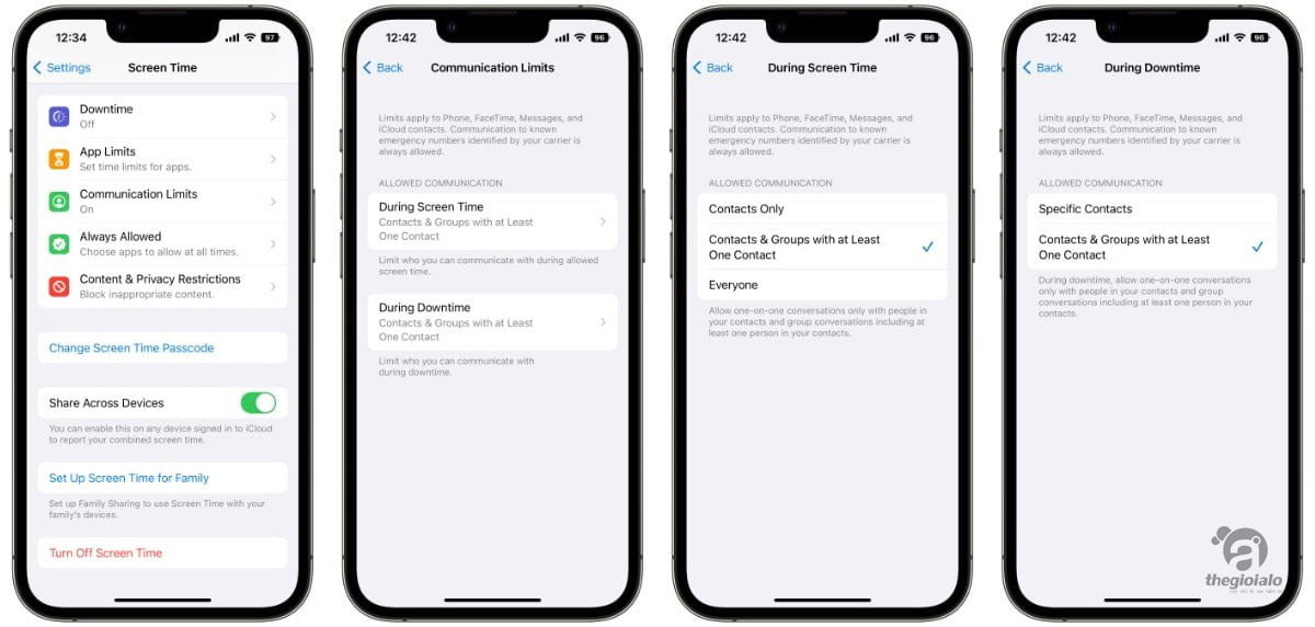 Hai tùy chọn cho những giới hạn này bao gồm người mà trẻ có thể giao tiếp trong Thời gian sử dụng thiết bị hoặc thời gian ngừng hoạt động. Ba tùy chọn khả dụng là Chỉ Danh bạ, Danh bạ & Nhóm với Ít nhất Một Liên hệ hoặc Mọi người.